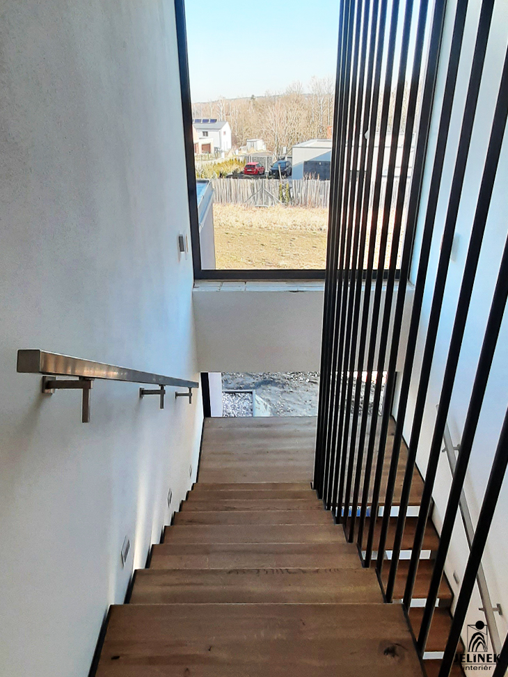 Klíčovým prvkem této realizace je spojení masivních stupňů a zábradlí s kulatými příčkami, které interiéru dodávají vzdušnost a moderní vzhled.