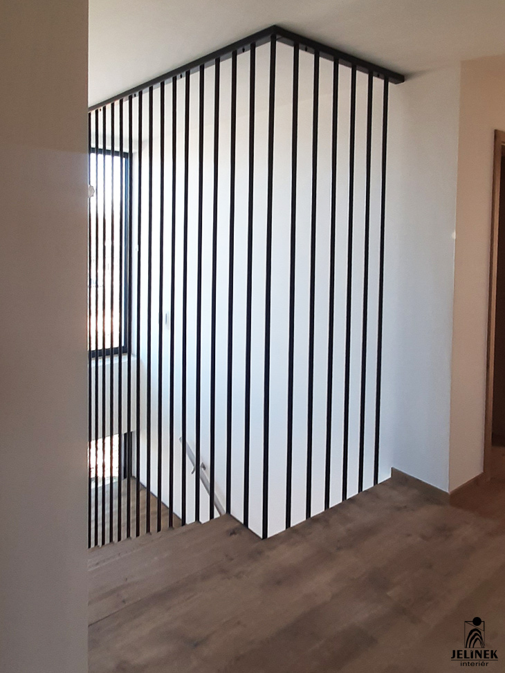 Toto zábradlí a obklady schodiště mají za úkol sjednocovat interiér v kompaktní celek celodřevěného provedení.