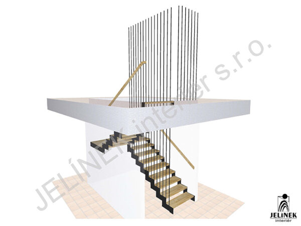 Samonosné schodiště s hranatým vertikálním táhlovým zábradlím