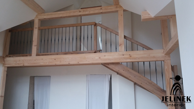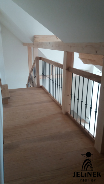 Klíčovým prvkem této realizace je spojení masivních stupňů a zábradlí s kulatými příčkami, které interiéru dodávají vzdušnost a moderní vzhled.