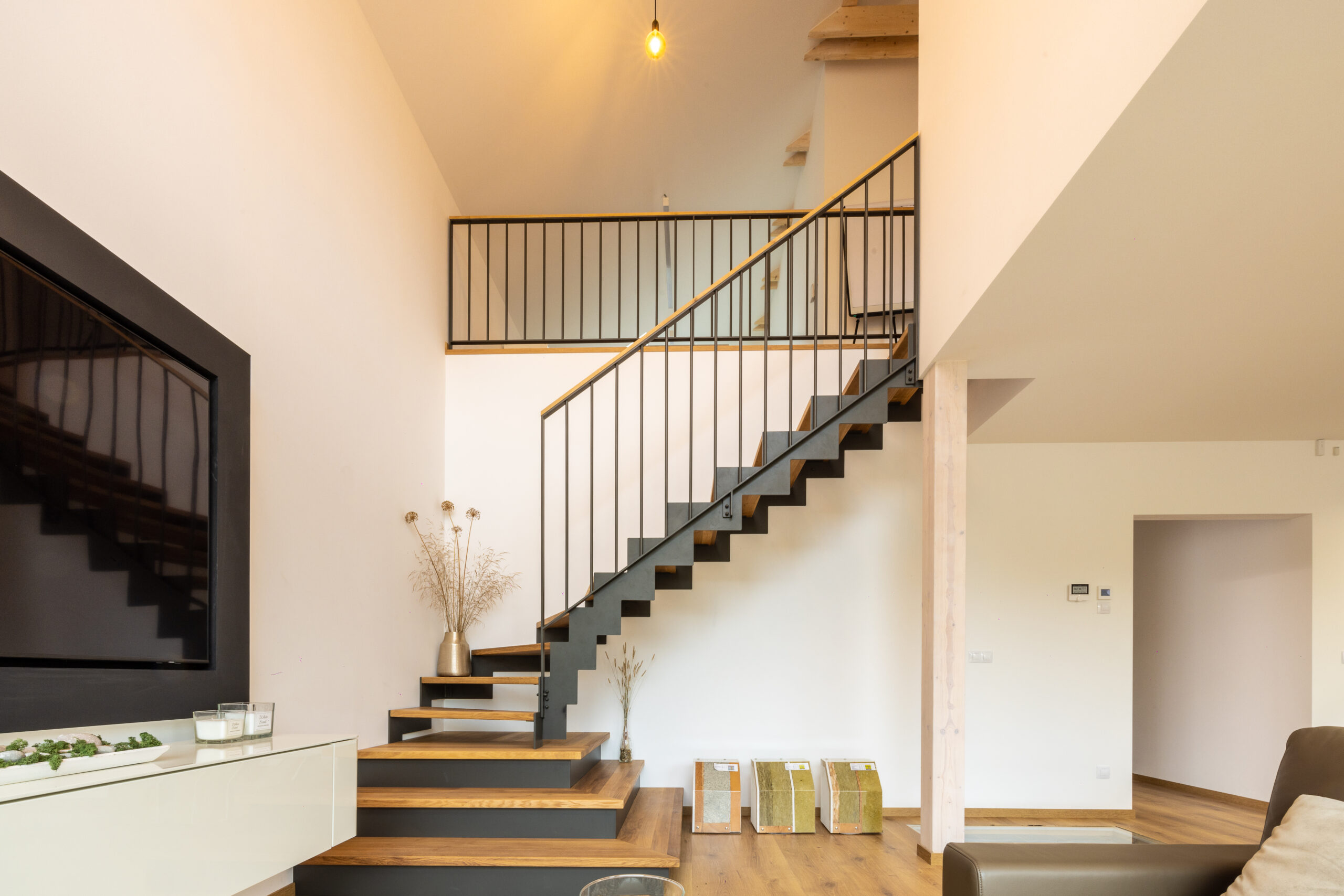 Součástí sestavy je pásovinové zábradlí se svislou kulatou výplní, vyrobené z ocelových prvků a práškované dle vzorníku RAL – v tomto případě v antracitovém odstínu. Zábradlí je vedeno po celé délce schodiště i na horní galerii, kde elegantně navazuje na zábradlí podél schodišťového ramene. Děkujeme společnosti GOOPAN za možnost spolupracovat na relizaci tohoto interiéru.