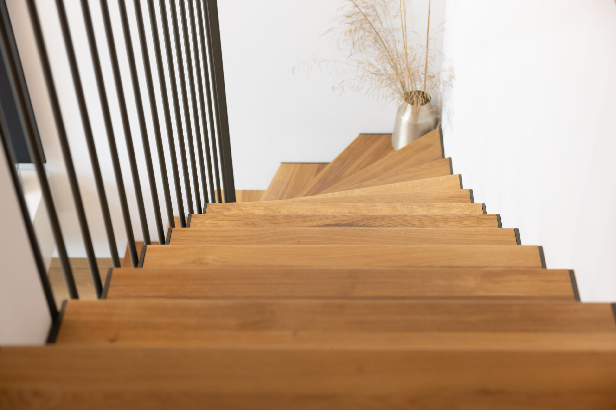 Nosnou konstrukci tvoří zubaticová schodnice z oceli, která zajišťuje stabilitu a zároveň dodává schodišti technicko-minimalistický charakter. Do této schodnice jsou zespodu kotveny masivní dubové stupně, které jsou povrchově upraveny přírodním olejem pro zvýraznění kresby dřeva a sladění s podlahou v obytné části.
