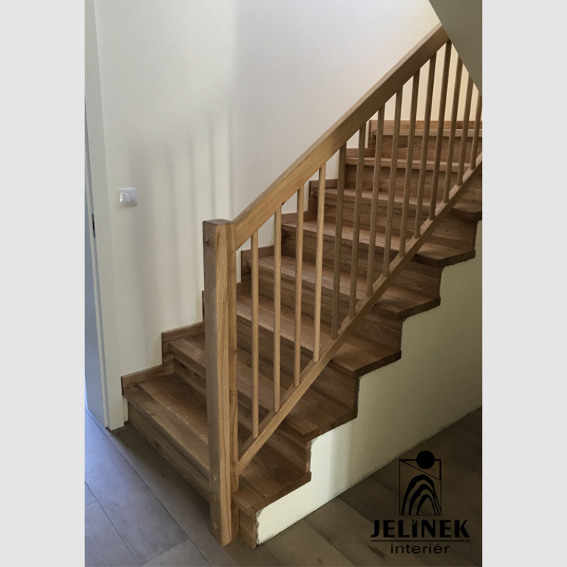 Klíčovým prvkem této realizace je spojení masivních stupňů a zábradlí s kulatými příčkami, které interiéru dodávají vzdušnost a moderní vzhled.