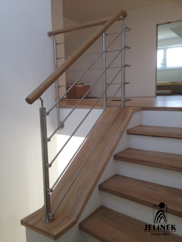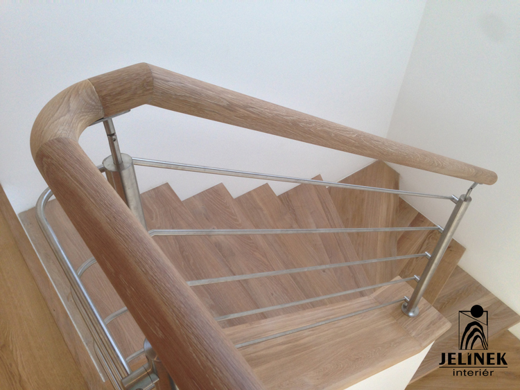Klíčovým prvkem této realizace je spojení masivních stupňů a zábradlí s kulatými příčkami, které interiéru dodávají vzdušnost a moderní vzhled.