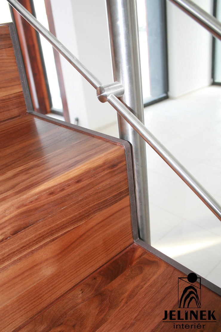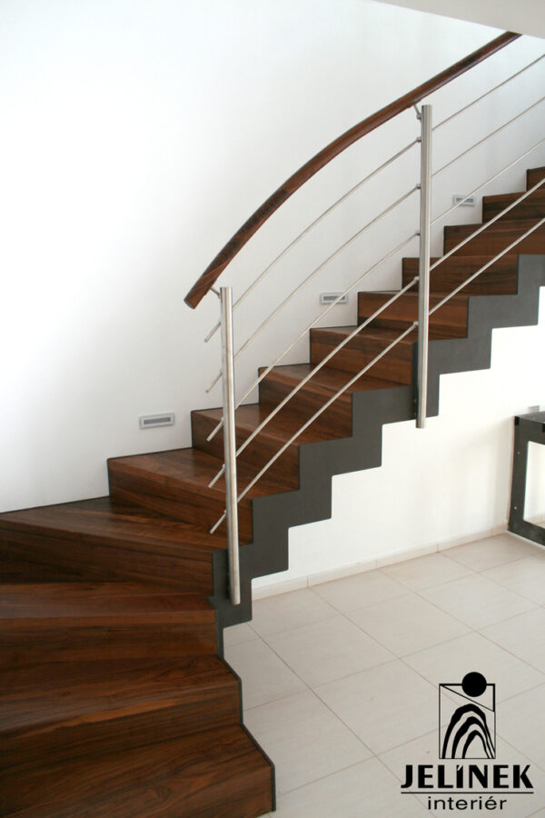 Klíčovým prvkem této realizace je spojení masivních stupňů a zábradlí s kulatými příčkami, které interiéru dodávají vzdušnost a moderní vzhled.