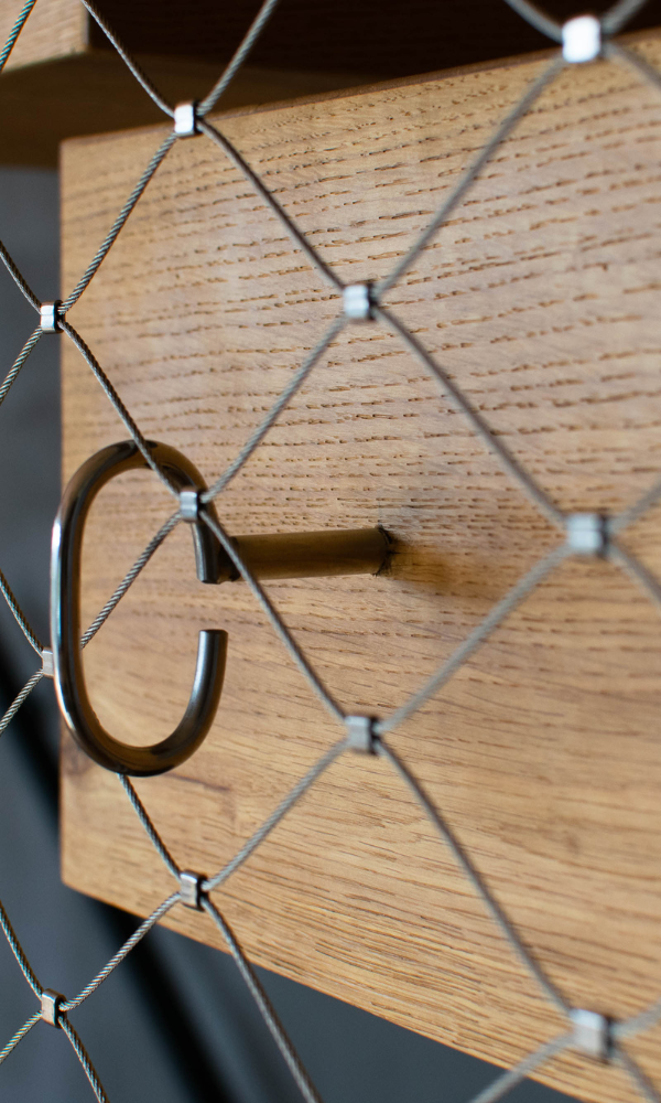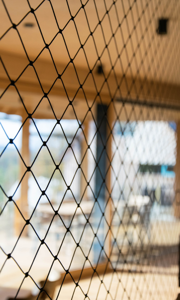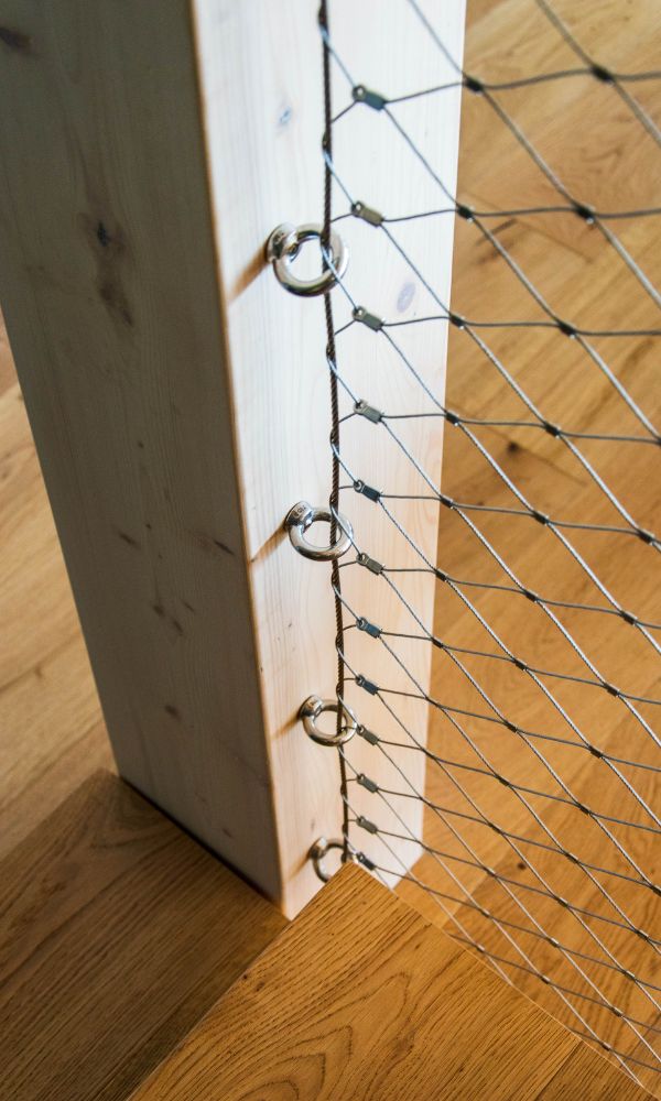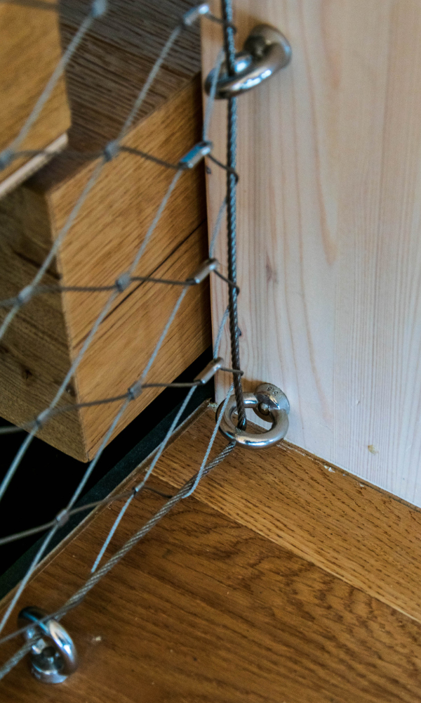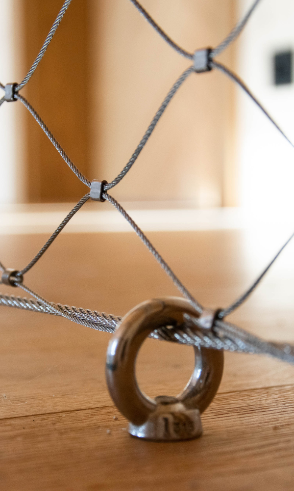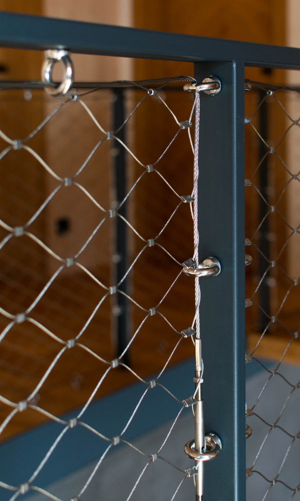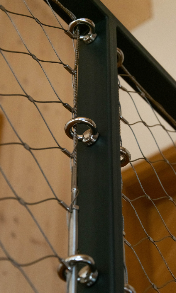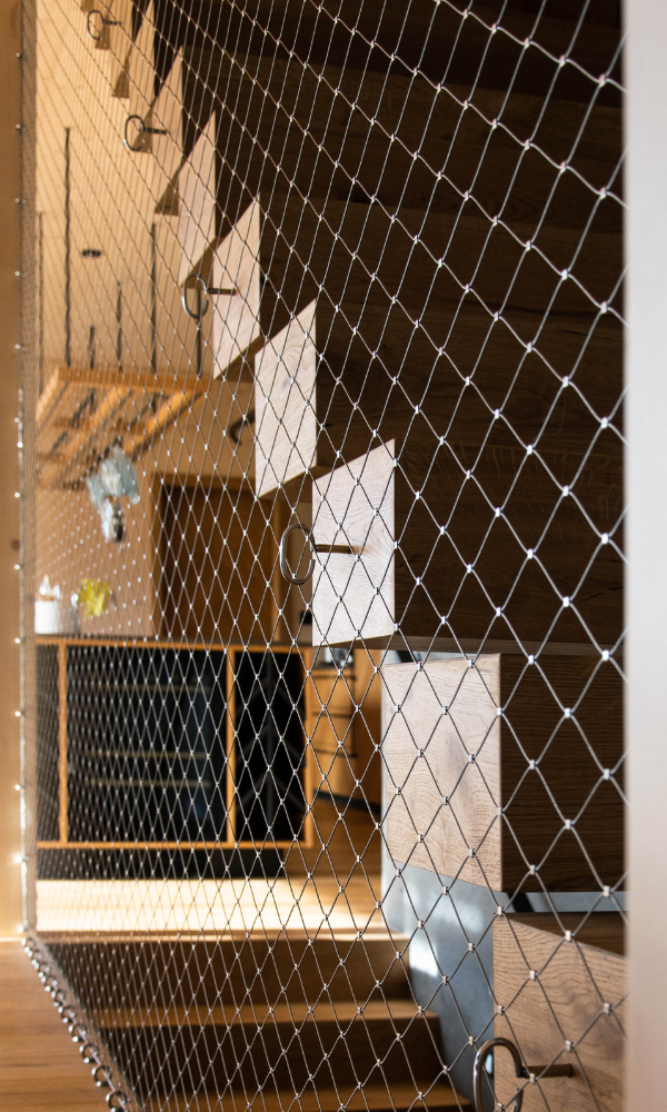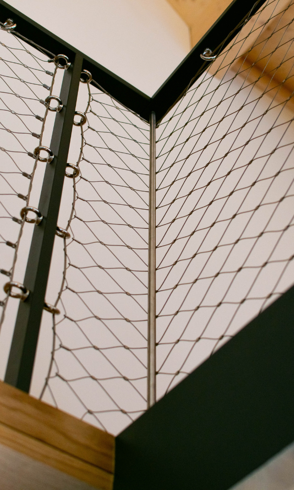 Jedním z klíčových prvků této realizace byla síťovinová výplň zábradlí, která sehrála zásadní roli nejen po stránce bezpečnosti, ale také v celkovém estetickém vyznění interiéru. Výplň tvoří síť z nerezového ocelového lanka s jemnou strukturou, která zajišťuje dostatečnou ochranu proti pádu, ale zároveň neuzavírá prostor pohledově ani světelně.