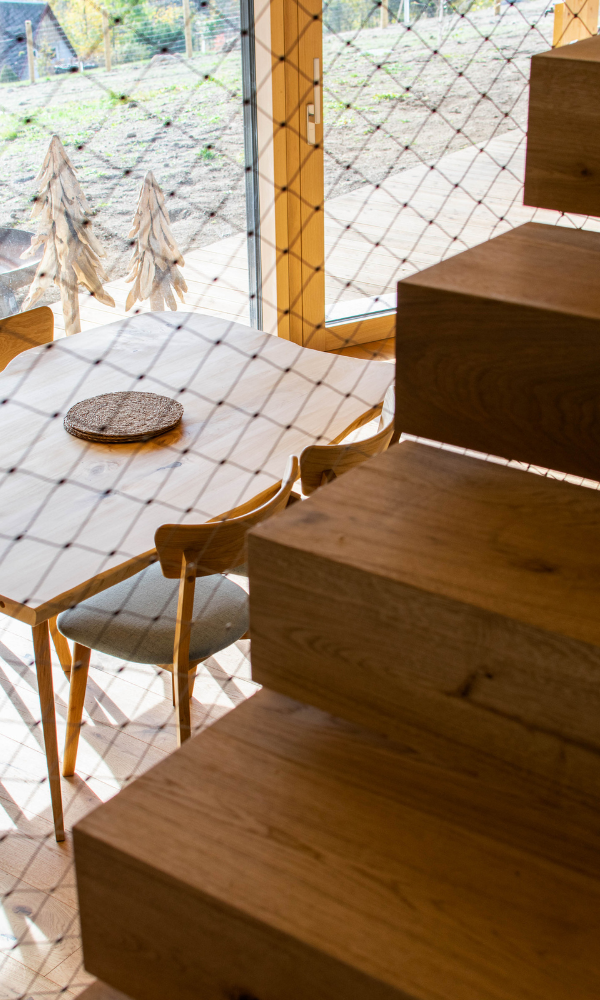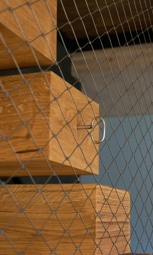 Celé schodiště je centrálním prvkem interiéru – jak z hlediska funkce, tak vizuálního dojmu. Skladba masivních dřevěných stupňů na páteřové ocelové konstrukci spolu se síťovinovou výplní zábradlí vytváří kontrastní, ale harmonický celek. Síťovinová výplň tak nefunguje jen jako bezpečnostní doplněk, ale jako výrazný designový motiv, který dotváří charakter prostoru.
