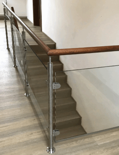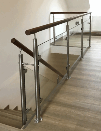Zábradlí tvoří nerezová konstrukce, dvě vrstvené skleněné tabule a dřevěné madlo z masivního dubu. Nerezové sloupky jsou ukotveny do podlahy, speciální vrstvené skleněné tabule jsou následně uchyceny mezi jednotlivé sloupky. Zábradlí je zakončeno masivním dubovým madlem pro příjemný stisk, a je ukotvené na tzv. „podmadélku“.