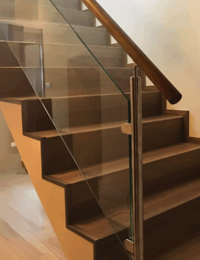 Celoskleněné zábradlí kotvené do stupňů slibuje minimalistický design a maximální bezpečnost. Perfektní řešení pro schodiště.