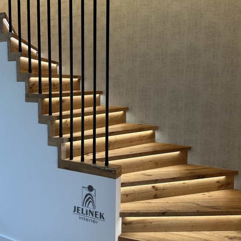 Moderní obklad schodiště s tónovaným dřevem a celoskleněným zábradlím působí vzdušně a elegantně. LED podsvícení zvýrazňuje každý stupeň a dodává prostoru jedinečnou atmosféru.