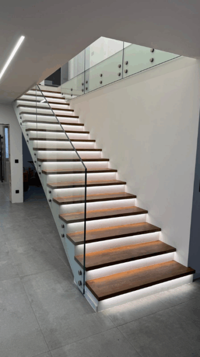 Moderní obklad schodiště s tónovaným dřevem a celoskleněným zábradlím působí vzdušně a elegantně. LED podsvícení zvýrazňuje každý stupeň a dodává prostoru jedinečnou atmosféru.