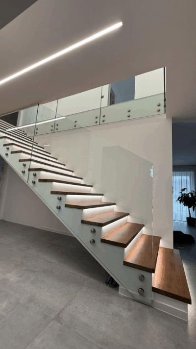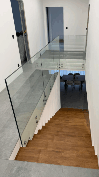Celoskleněné zábradlí kotvené do stupňů slibuje minimalistický design a maximální bezpečnost. Perfektní řešení pro schodiště.