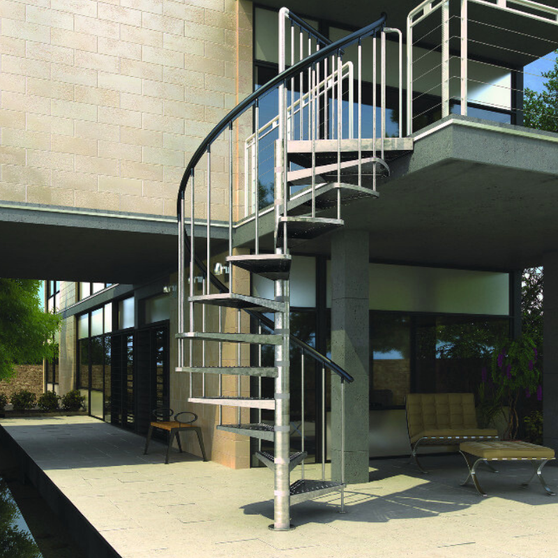 Toto robustní vřetenové schodiště bylo vyrobeno ze žárem pozinkovaného kovu, ale existuje také možnost varianty z pozinkovaného děrovaného plechu, nebo Trimaxu. Nabízíme také příplatkovou variantu zábradlí s podestou.