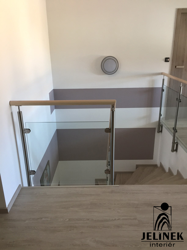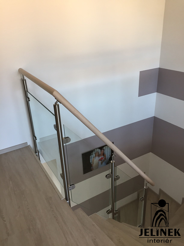 Realizovali jsme celoskleněné zábradlí podél schodiště s masivním dubovým madlem.