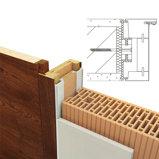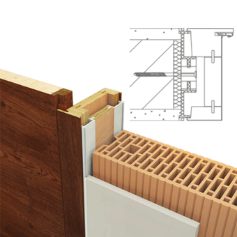 Rám a dveřní křídlo v jedné rovině se stěnou, dveřní křídlo se otevírá ve směru do ostění, zarubeň na pantové straně 60 mm a na záklopové straně 45 mm, rám z masivního dřeva lepený v několika vrstvách, hliníkové dveře Tectus 240 panty, stříbrná, protiplech pro magnetickou západku, rozsah nastavení 0 mm, nutná montáž kontra rámu před omítkou.