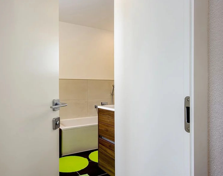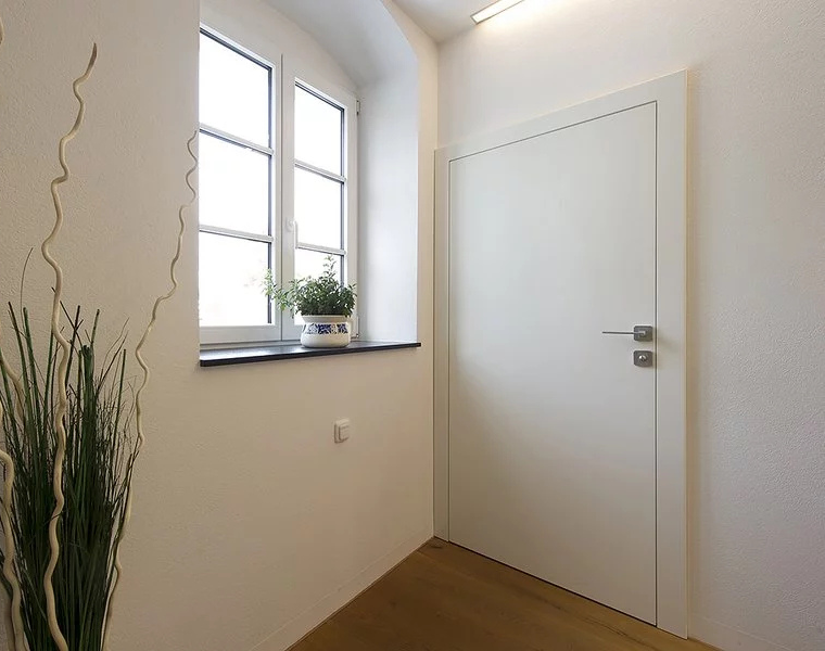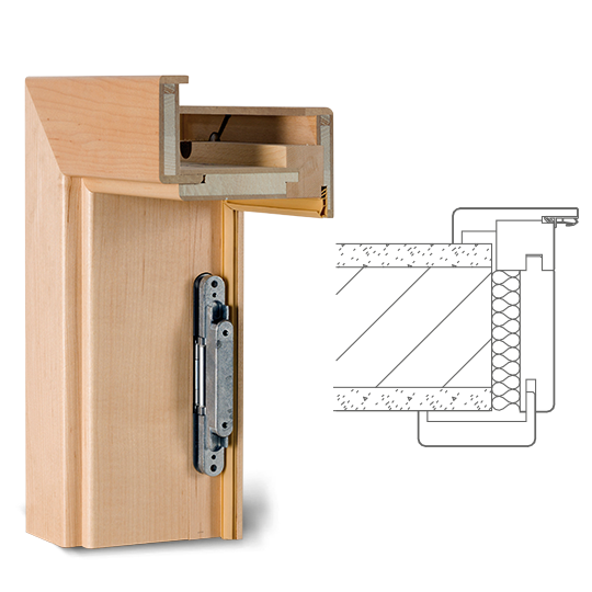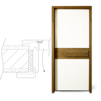 Rám neviditelný zabudovaný v ostění a dveřní křídlo v jedné rovině se stěnou, dveřní křídlo se otevírá ve směru do ostění stěny (reverzní). Hliníkový rám FLAT-IN jako zapuštěný rám pro omítku a nebo sádrokarton včetně omítkové sítě a montážních držáku. Sada lišt z masivního dřeva a s dveřní panty Tectus 240, protiplech pro magnetickou západku, hliníkový rám je umístěn v přední části zarovno s omítkou.