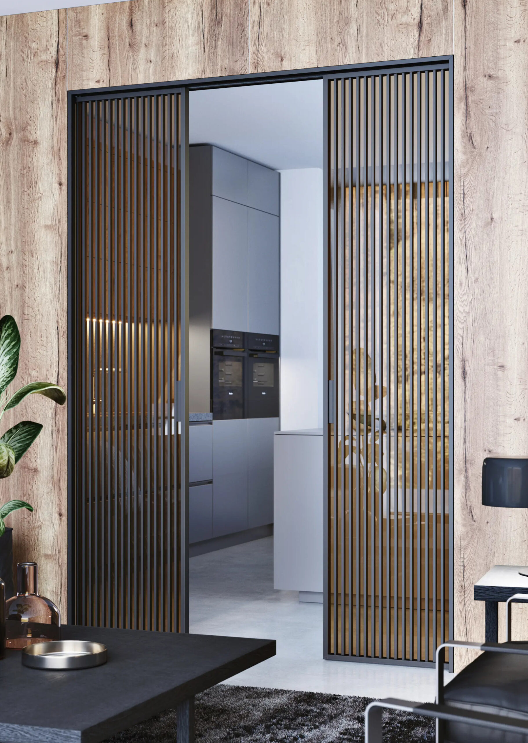 Neobvyklé provedení interiérových dveří s průchozím otvorem v plné světlé výšce místnosti. Takovéto dveře v interiéru navozují vyšší míru luxusu a krásně propojují jednotlivé místnosti.