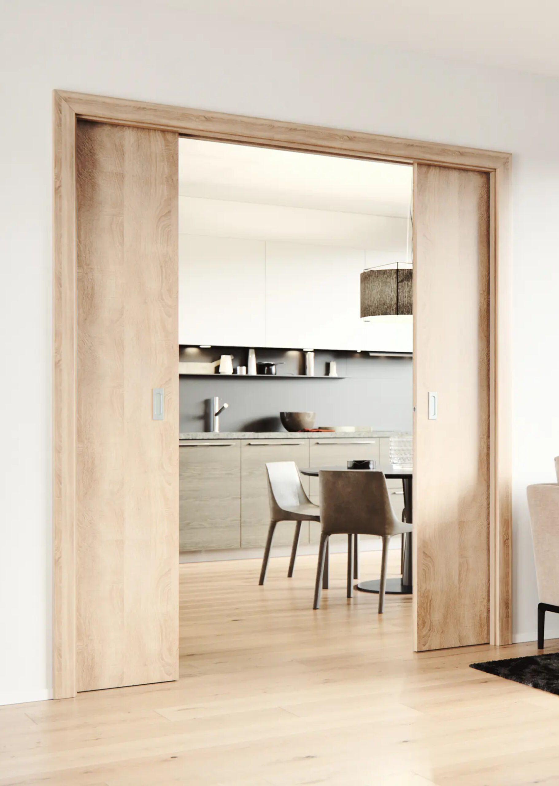 JAP Profikit Komfort představuje typ skládacího stavebního pouzdra do SDK pro dvoukřídlé zasouvací dveře, které je určeno pro namontování obložky.